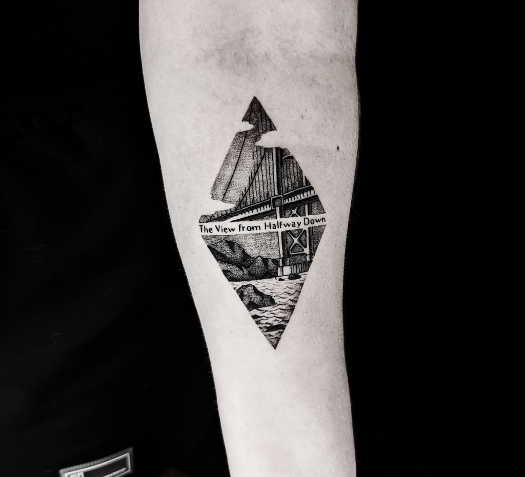 My tattoo is based on the poem copied below from the Netflix show “Bojack Horseman,” entitled “The View From Halfway Down.” It personally serves as an important perspective reset, and a reminder that suicide is permanent.