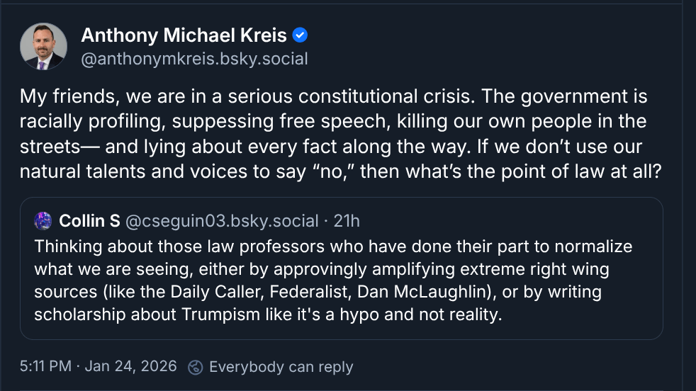 Our silence also normalizes this. If we do not teach our students that the government cannot kill them or their clients for lawfully exercising their rights, then we are quietly training them to accept unchecked state violence as a background condition for the practice of law. Perhaps worse, our silence falsely suggests there are two defensible sides to the rule of law. There are not. There is no “getting to maybe” when it comes to our basic freedoms.